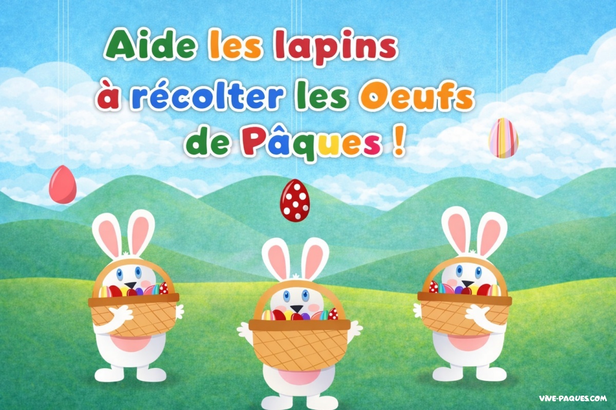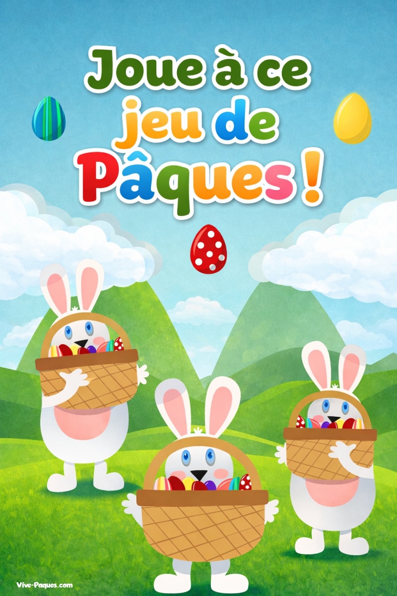 Pâques est une fête associée à la joie du printemps, aux lapins et aux célèbres chasses aux œufs. Dans de nombreux pays, les enfants partent à la recherche d’œufs en chocolat ou décorés cachés dans les jardins. Ici, les œufs tombent du ciel et les lapins doivent être rapides pour les attraper. Les couleurs vives, les lapins malicieux et les paysages printaniers rappellent l’univers joyeux de cette fête traditionnelle. Une façon amusante de retrouver l’esprit des chasses aux œufs dans un petit jeu d’adresse simple et accessible.